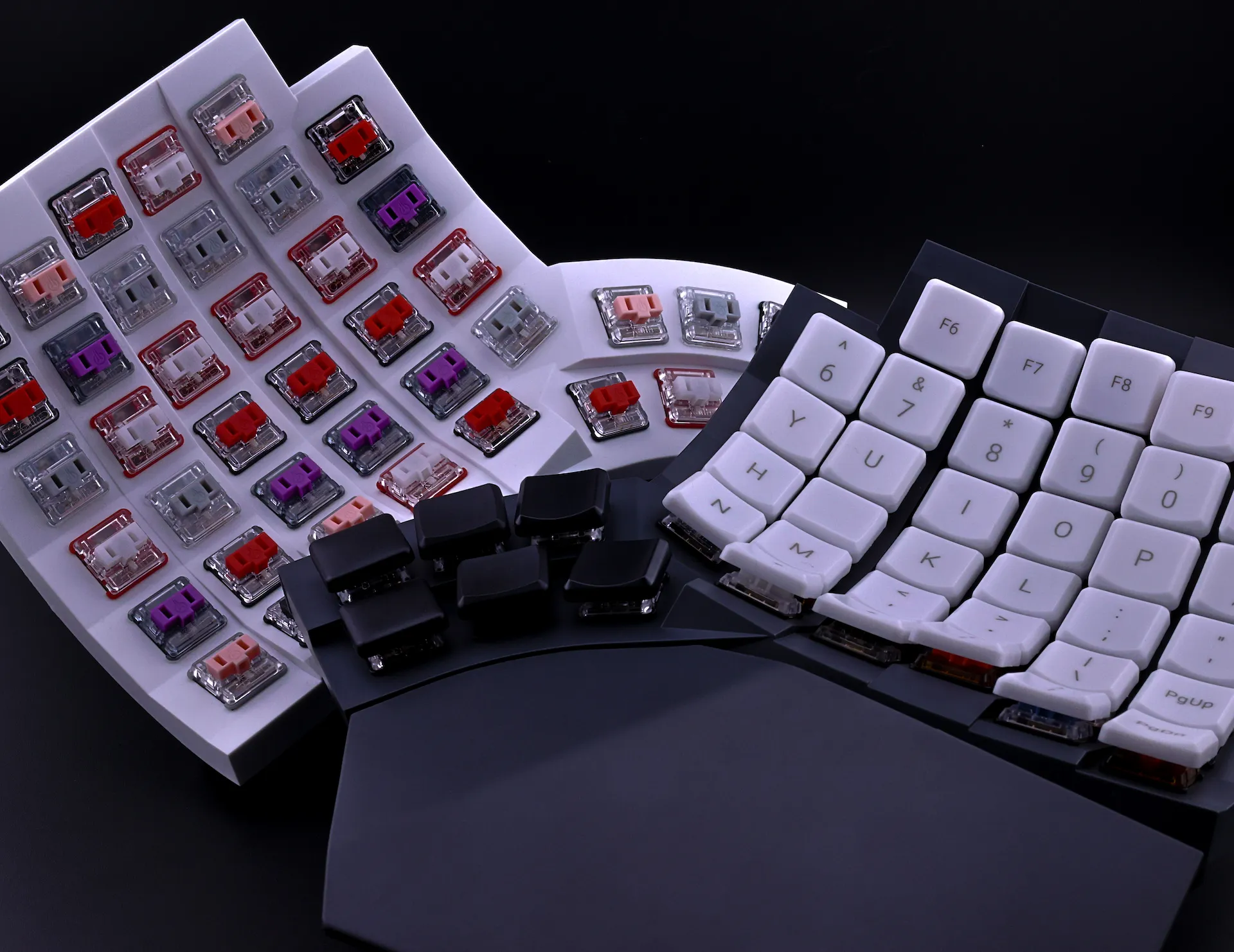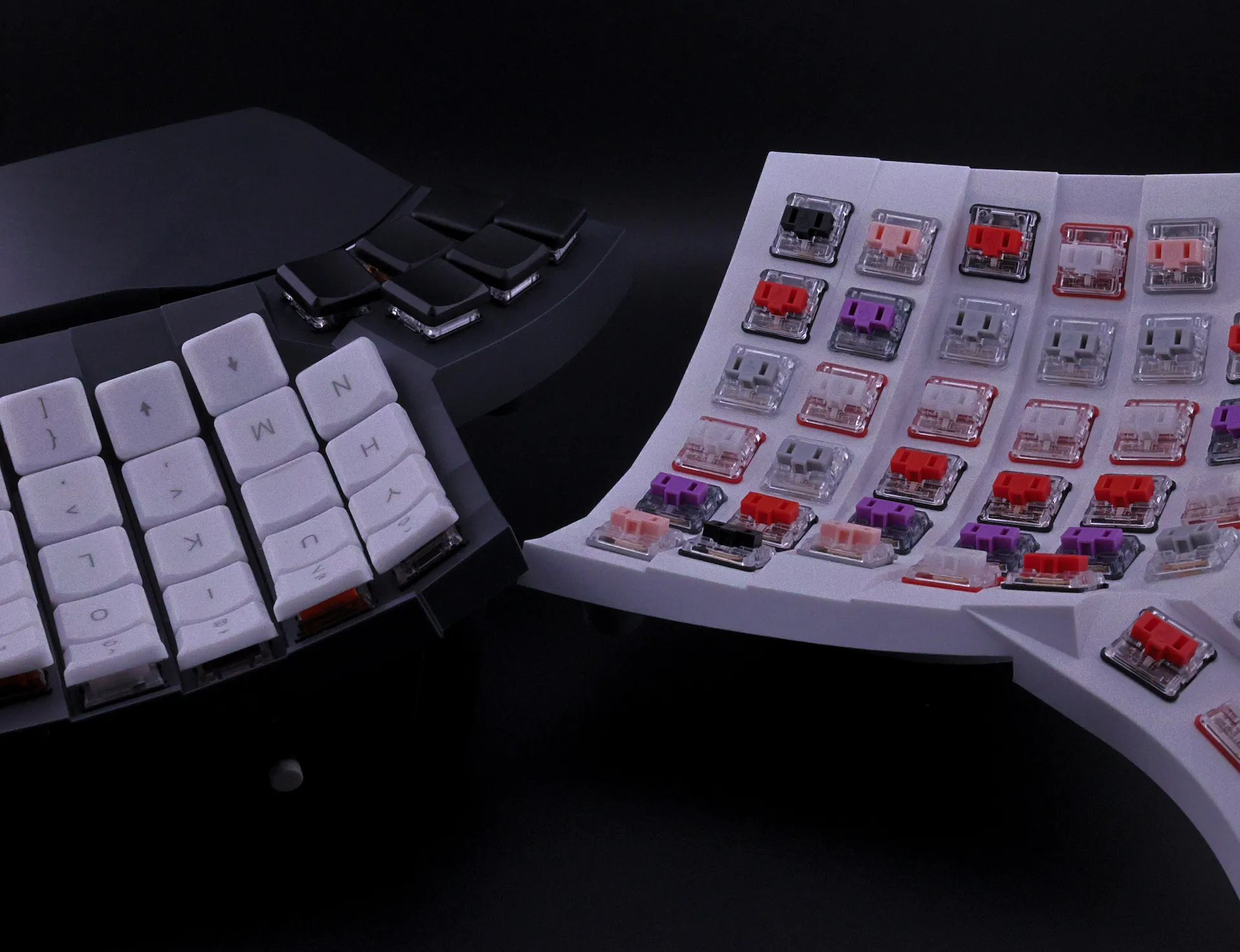 Try out a custom MoErgo Glove80 with 12 different switches, all key cap profiles and all colorways.
